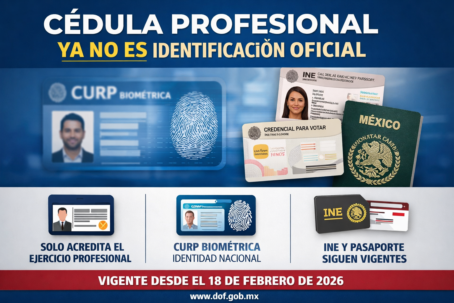 El 17 de febrero de 2026 se publicó en el Diario Oficial de la Federación un aviso mediante el cual la Secretaría de Educación Pública precisó que la cédula profesional, tanto física como electrónica, no constituye documento de identificación oficial. Su función queda limitada exclusivamente a acreditar el derecho al ejercicio profesional conforme a la legislación aplicable.