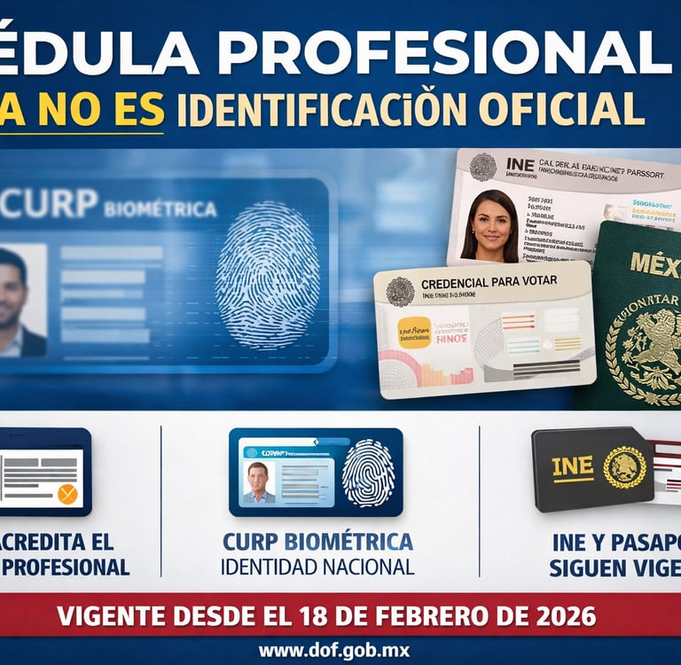 Análisis jurídico del aviso publicado en el Diario Oficial de la Federación el 17 de febrero de 2026 mediante el cual la Secretaría de Educación Pública precisa que la cédula profesional, física o electrónica, deja de considerarse identificación oficial y queda limitada a acreditar el ejercicio profesional. El artículo explica el sustento constitucional y legal del cambio, su relación con la CURP biométrica prevista en la Ley General de Población y el impacto práctico para empresas, sujetos obligados en materia PLD y profesionistas que deben ajustar sus procesos de validación de identidad y cumplimiento normativo.