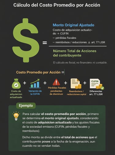 Por esta razón, el costo promedio por acción se construye a partir del denominado monto original ajustado, el cual integra el costo comprobado de adquisición debidamente actualizado y se ve incrementado o disminuido por diversos conceptos fiscales que reflejan la historia económica y fiscal de la sociedad emisora, tales como la variación de la Cuenta de Utilidad Fiscal Neta, las pérdidas fiscales pendientes de disminuir, los reembolsos pagados y las diferencias previstas en el artículo 77 de la propia Ley. De esta forma, la ganancia gravable pretende reflejar el beneficio económico efectivamente obtenido por el contribuyente.