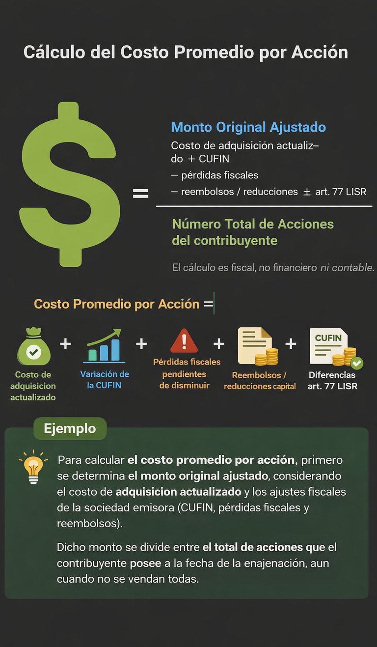 El costo promedio por acción se determina por contribuyente y considera la totalidad de las acciones que éste posea de la misma persona moral a la fecha de la enajenación, aun cuando no enajene la totalidad de ellas.