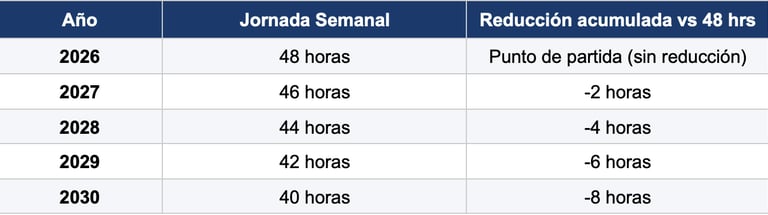 Aunque la redacción final señala 40 horas semanales, el artículo Tercero Transitorio establece que la jornada de 40 horas será alcanzada de forma gradual. La jornada legalmente aplicable en cada año calendario es la que se indica en la siguiente tabla: