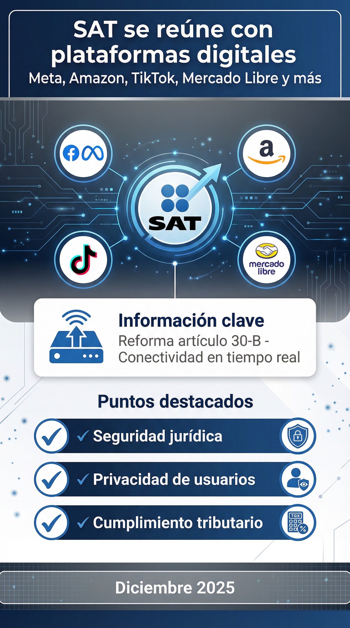 El SAT tendrá conexión fiscal en tiempo real con Meta, Amazon y TikTok (Art. 30-B CFF). Conozca el objetivo de IVA y cómo evitar la vigilancia fiscal instantánea.